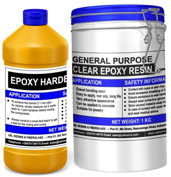 Buy high quality clear epoxy resin and hardener at discounted prices and get delivery to Kampala and other locations in Uganda today. We are the only suppliers of clear epoxy resin in the country. The resin you buy is an eco friendly solvent free gravel bonding resin you can use to produce a high class surface finish to your paths and driveways, also bond the gravel slate etc in tree planters and decorative garden areas. Other applications include jewelry and river resin table tops.